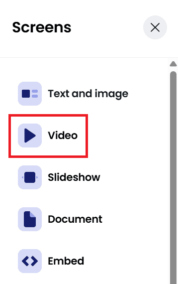 Open the course you’re working on and click Add screen > Video.